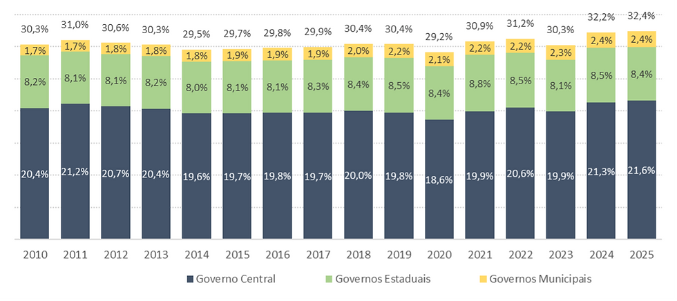 De acordo com o boletim, o resultado representa um aumento em relação a 2024, quando a carga estava em 32,22% do PIB, evidenciando uma elevação gradual na arrecadação pública. O crescimento foi puxado principalmente pelo governo central, que registrou avanço associado ao aumento da arrecadação de impostos como o Imposto de Renda Retido na Fonte (IRRF) e o Imposto sobre Operações Financeiras (IOF), além da expansão das contribuições previdenciárias.